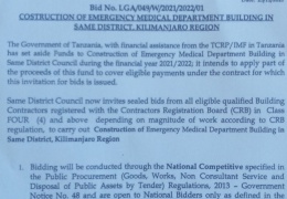 Mkurugenzi Mtendaji wa Halmashauri ya Wilaya ya Same anawaalika wakandarasi kuomba zabuni ya ujenzi wa jengo la dharura la Hospitali ya Wilaya ya Same na jengo la watumishi katika Hospitali ya wilaya ...
