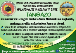 Msimamizi wa uchaguzi Jimbo la Same Mashariki na Magharibi, anatangaza RATIBA ya Kuchukua FOMU za UTEUZI kwa mujibu wa RATIBA iliyotolewa na TUME YA TAIFA YA UCHAGUZI.
